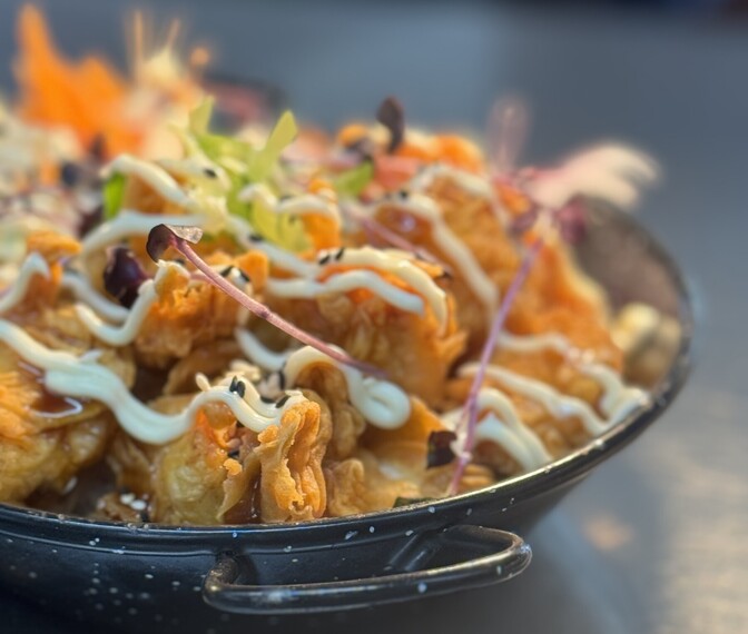 Salt and Pepper coated calamari with aioli and lime dressing.