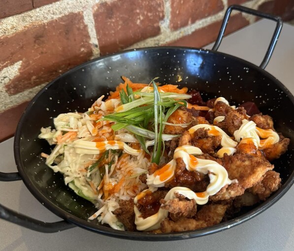 House made karaage chicken marinated in soy sauce served on warm rice with fresh cucumber, cabbage, carrot, spring onion drizzled with kewpie mayo, teriyaki sauce and toasted sesame seeds.