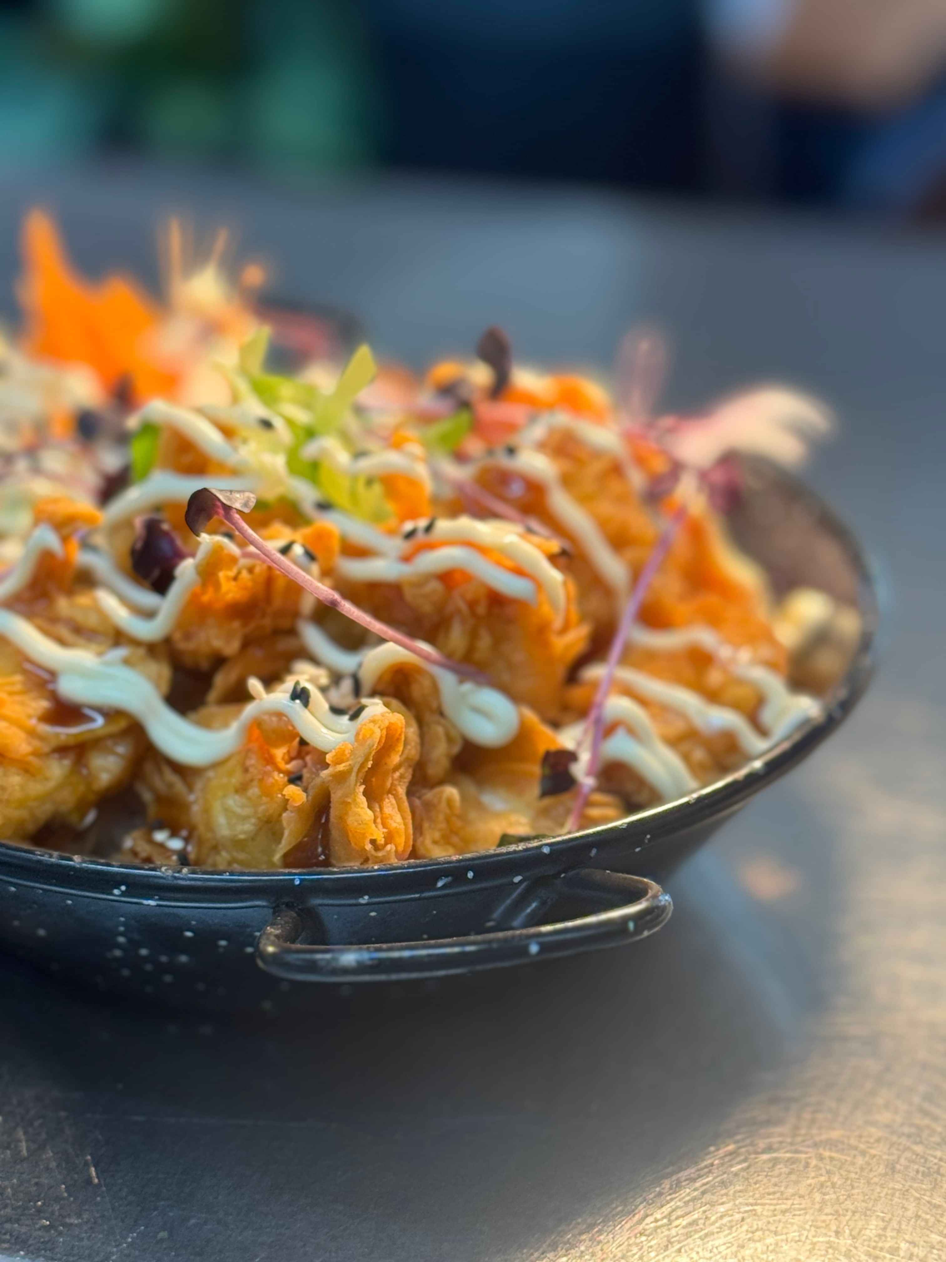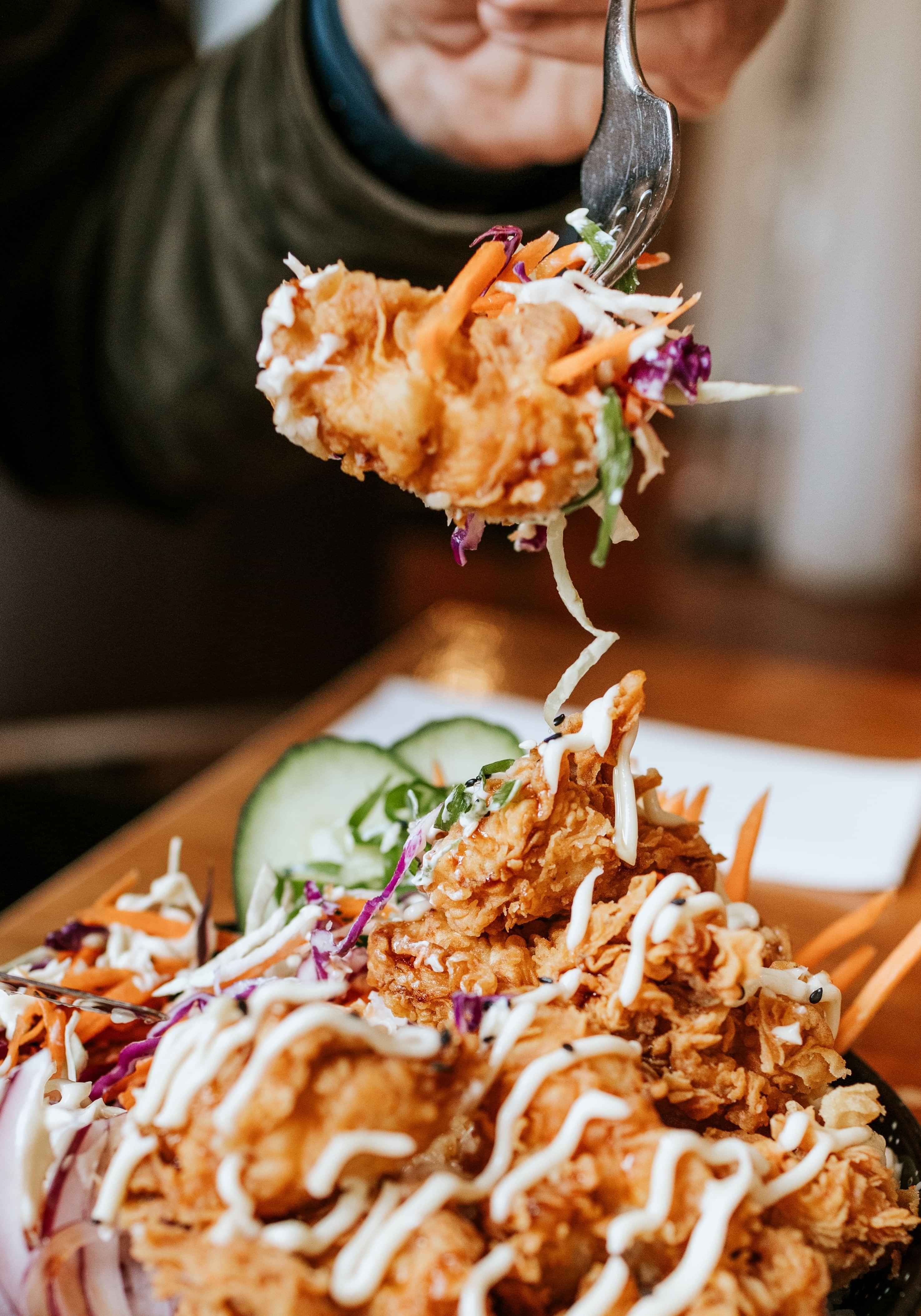House made karaage chicken marinated in soy sauce served on warm rice with fresh cucumber, cabbage, carrot, spring onion drizzled with kewpie mayo, teriyaki sauce and toasted sesame seeds.