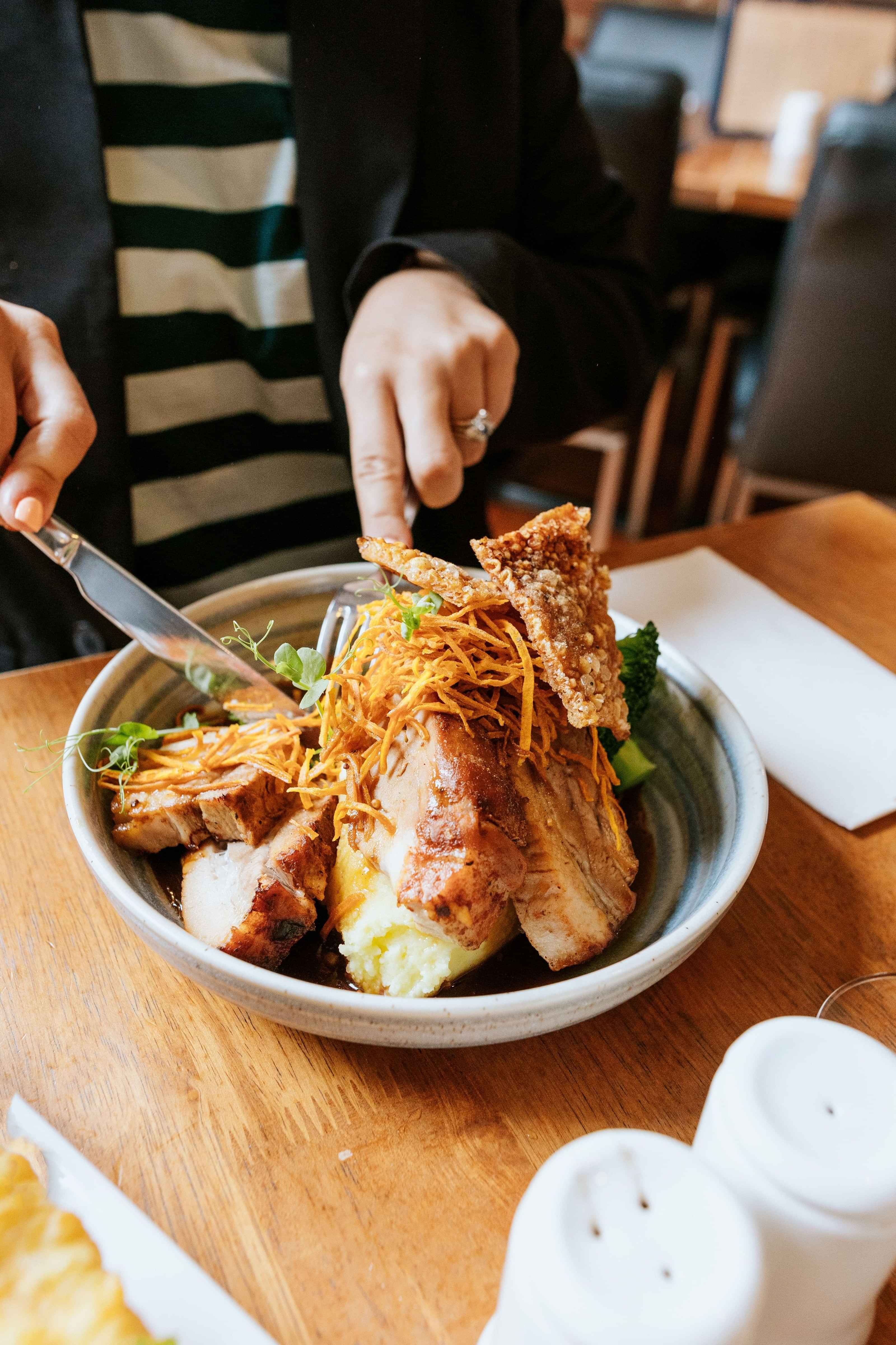 Succulent pork belly served on a bed of mash topped with our house made jus, broccolini, kumara crisp and of course crackling.